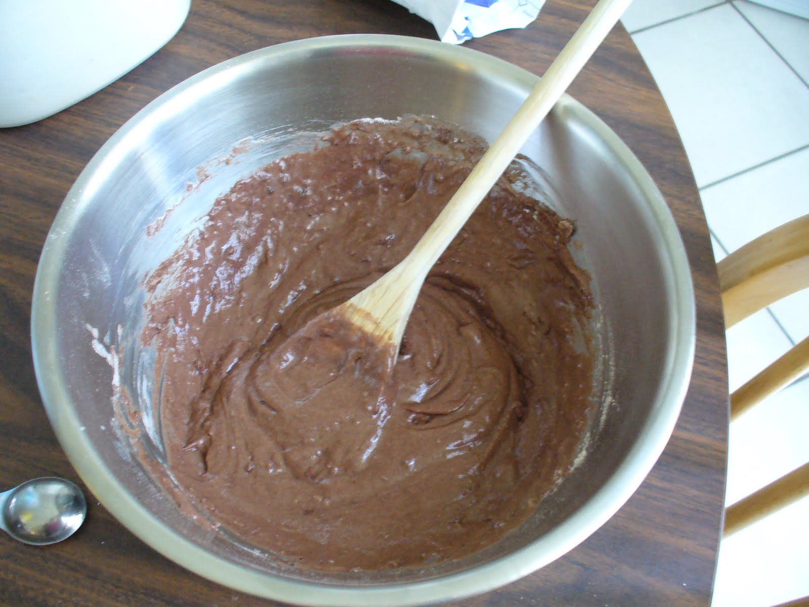 3. Stir in the milk, oil, vanilla until smooth. At this point you can add chocolate chips/and or nuts.